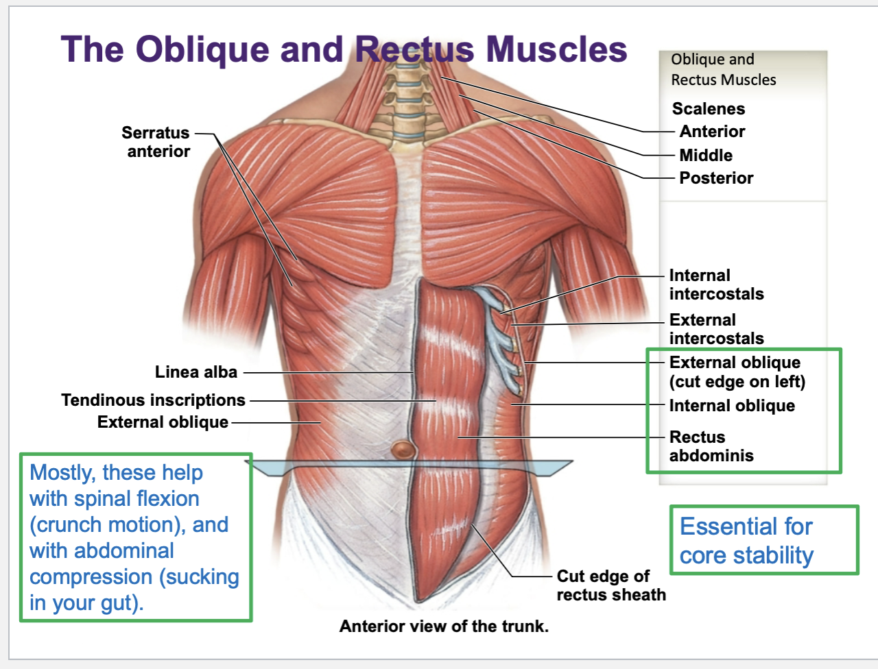 Common functions are to flex the torso, or to create compression of the torso — this is basically sucking in ur gut to tighten the abdominal wall