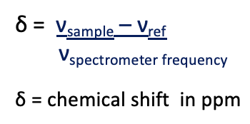 Frequency difference between the resonance observed for the nucleus and the resonance observed for the reference compound (usually TMS).