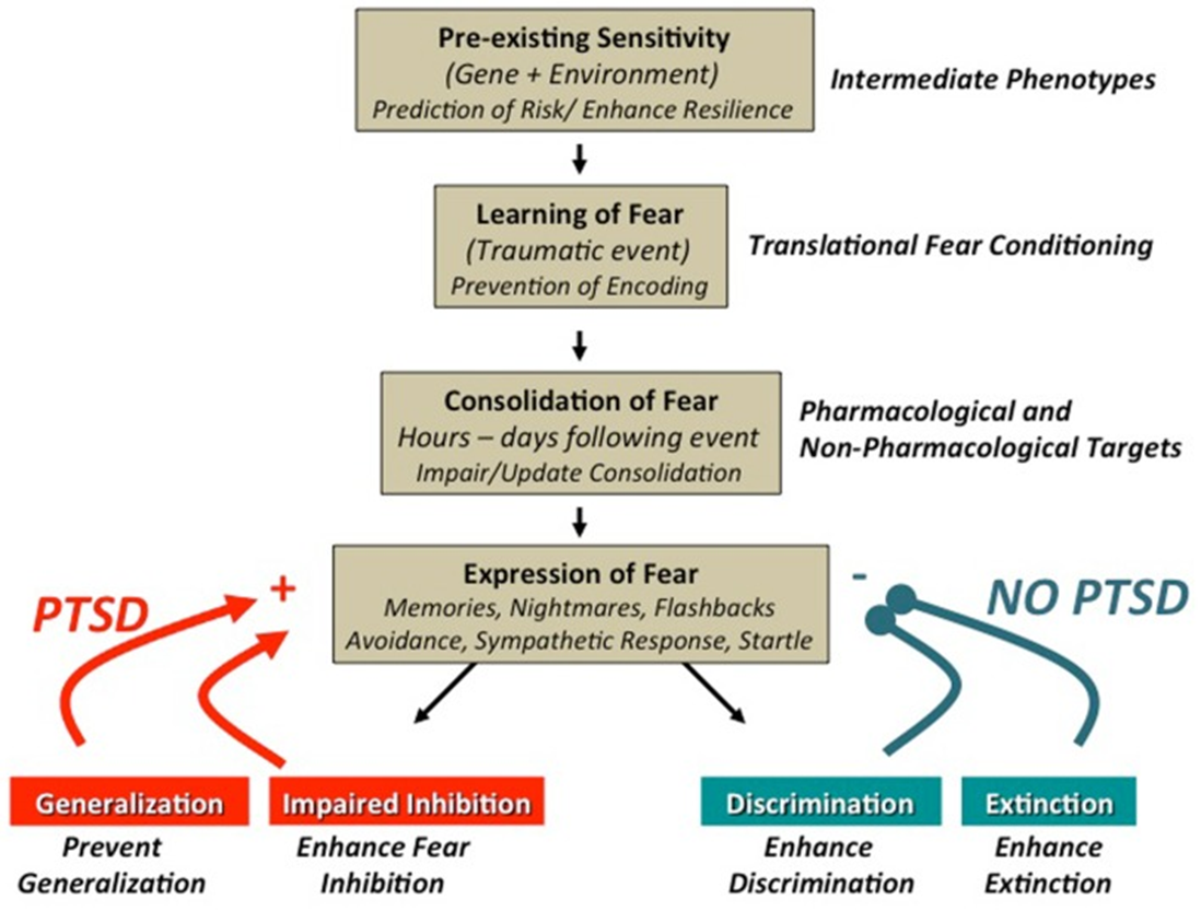 1) Patients with PTSD will consistently re-expose themselves to the trigger that caused the initial trauma resulting in enhancement and impaired discrimination due to extinction