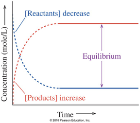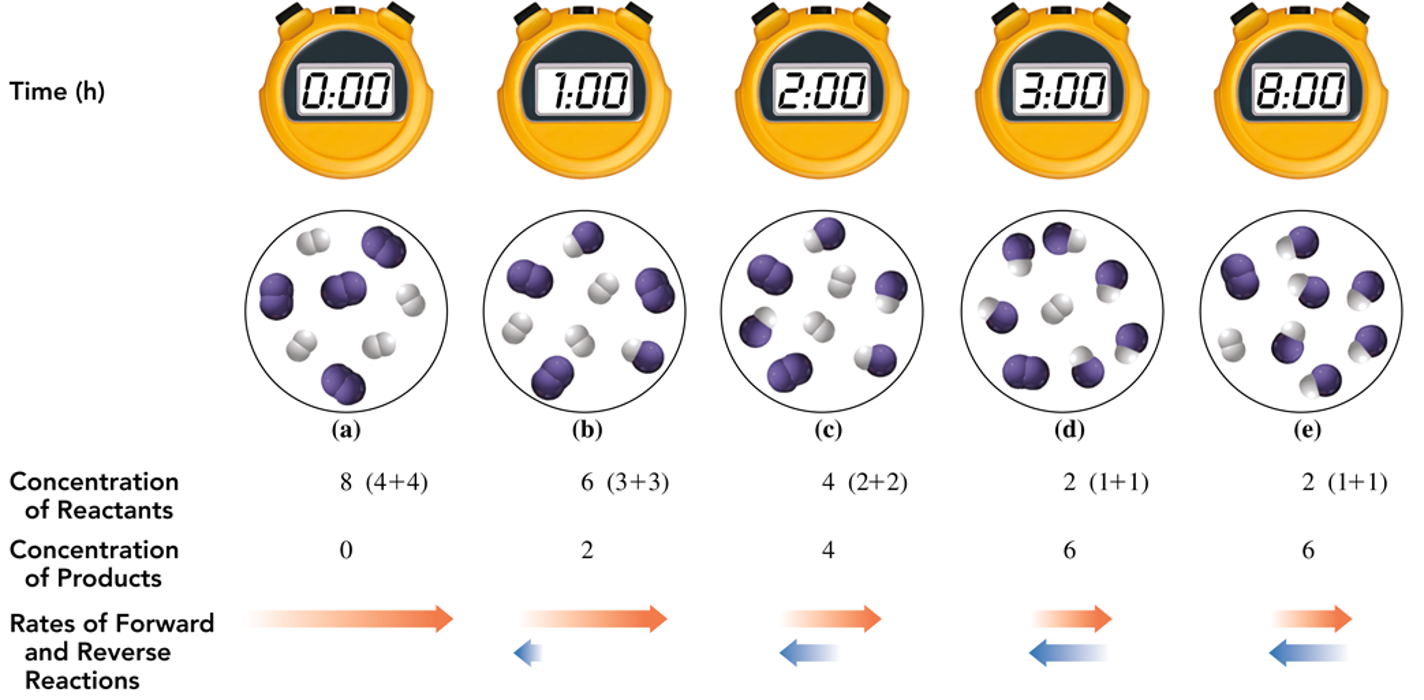 Reaction progression from initial state to equilibrium, with concentration changes over time.