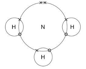 nitrogen is in group 5, so has 5 electrons in its outer shell. it shares 3 of these with hydrogen atoms that only have one electron in their outer shells to form stable ammonia. this can also be represented by: