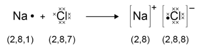 metal atoms transfer their electrons to non-metal atoms, become ions.