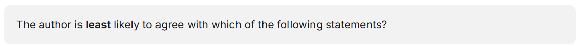 This question is something I struggle on the most, remember when there is least likely - the author disagrees.