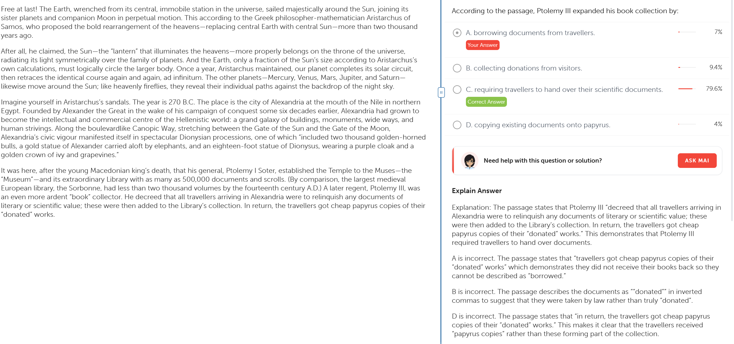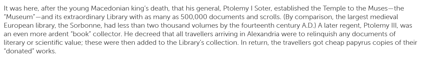 For this question feel into a trap: A => ‘borrow‘, while C => ‘required…to hand over‘. So, C is the correct answer, as last para ‘He decreed that all travellers arriving in Alexandria were to relinquish any documents of literacy or scientific value‘, so it was an act of compulsion.
