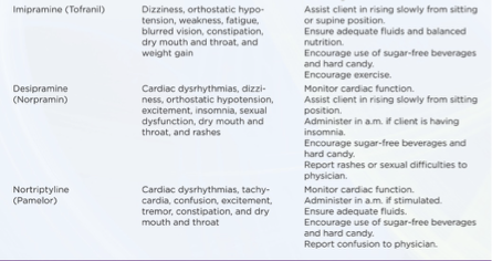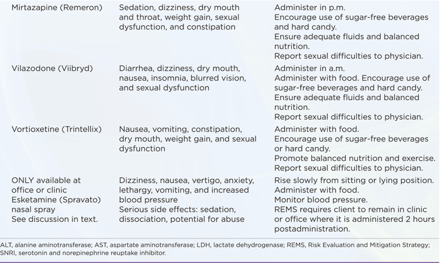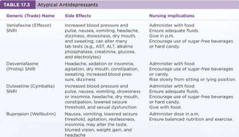 Venlafaxine (Effexor) | SNRI | Increased blood pressure, nausea, and dizziness | Administer with food. |