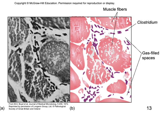 damaged /dead tissue + anaerobic conditions - germination, vegetative growth and release f toxins, fermentation of muscle carbohydrates - formation of gas and further destruction of tissue