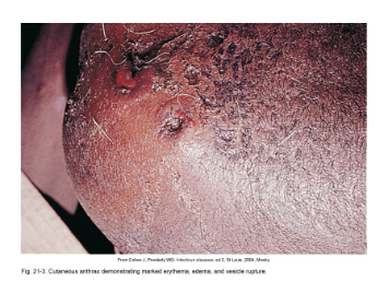 cutaneous- spores enter through skin, black sore- eschar; least dangerous