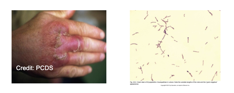 enters through skin abrasion, multiplies to produce erysipeloid, dark red lesions, fever, joint pain, rarely septicemia