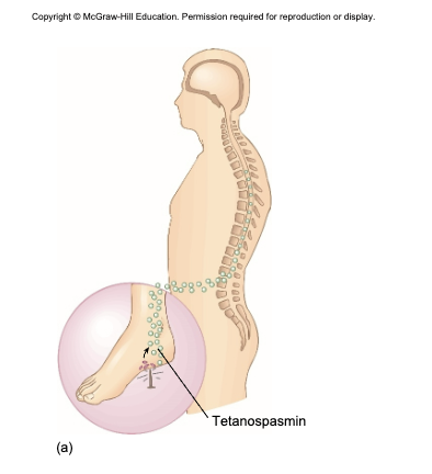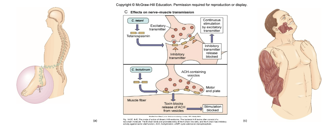 tetanospasmin - neurotoxin causes paralysis by binding to motor nerve endings; blocking the release of neurotransmitter for muscular contraction inhibition; muscles contract uncontrollably