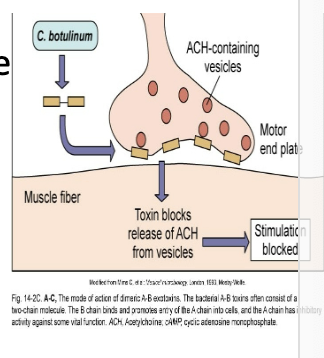 botulin toxin is carried to neuromuscular junctions and blocks the release of acetylcholine, necessary for muscle contraction to occur