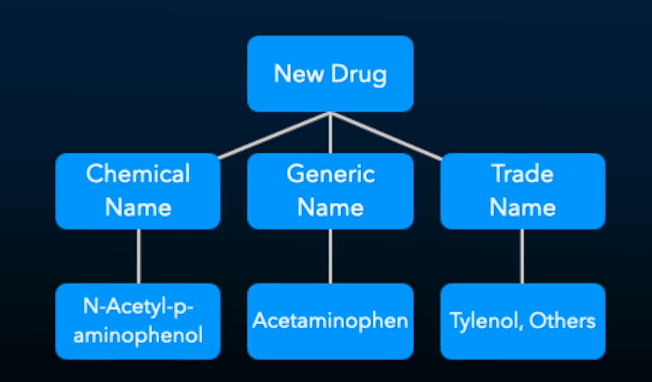 Chemical is chemical structure of drug, generic is shortened chem name, trade is brand name