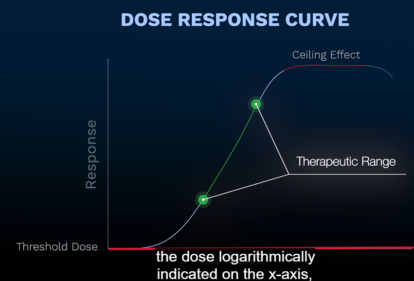 Discuss dose response curves—> refers to dosage of drugs and that effects beginning to appear at a certain level. The dosage and response can increase to a certain level until it plateaus, ceiling effect/maximal efficacy.