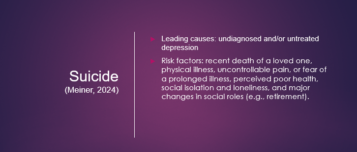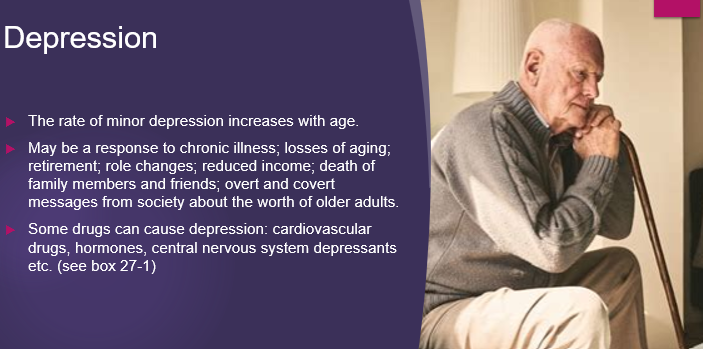 Causes and Contributing Factors: Chronic illnesses, aging-related losses (bereavement, relocation, retirement), changes in social roles and income, societal undervaluation of older adults; certain medications may contribute.