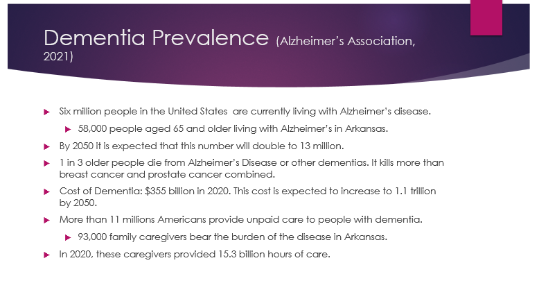 Alzheimer’s disease: Accounts for 60\%-80\% of dementia cases; characterized by beta-amyloid plaques and tau tangles.