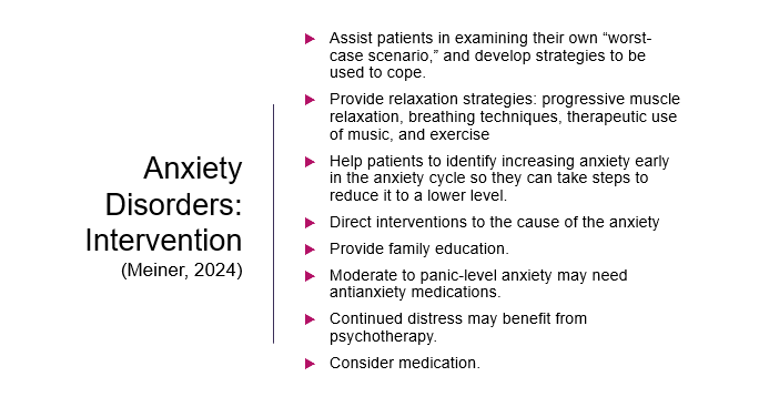 For Anxiety: Coaching and coping strategies; relaxation and deep breathing; modify perceptions of stress; psychotherapy and nonpharmacological approaches preferred.