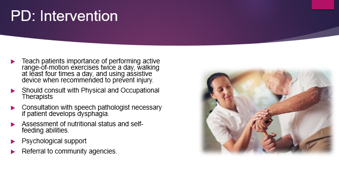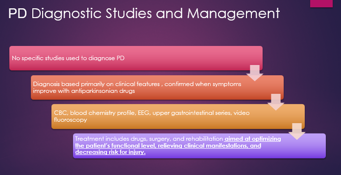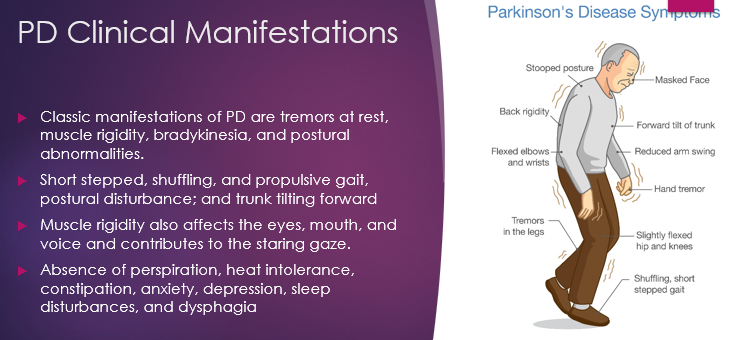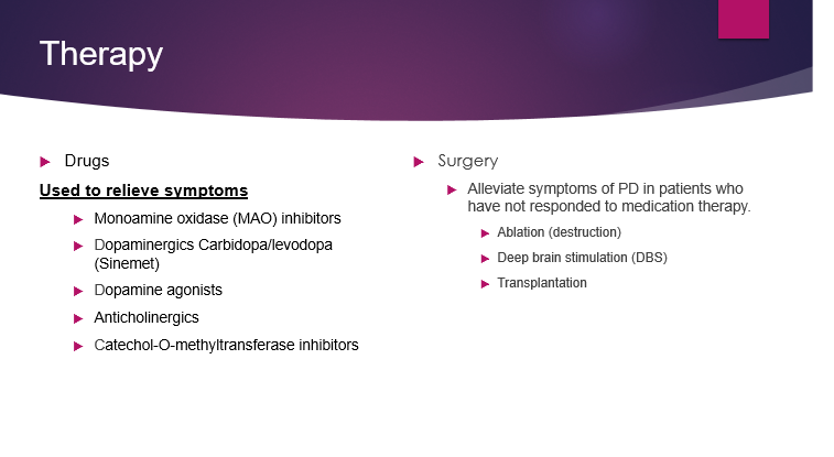 Parkinson’s disease=progressive degeneration of neurons in the basal ganglia resulting in the reduced production of dopamine