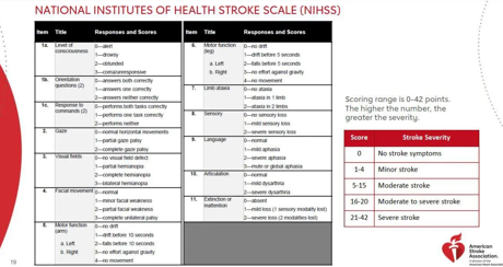 Neuro Assessment: NIH Stroke Scale or similar tools; assess level of consciousness, orientation, commands, gaze, visual fields, motor function, sensory, language, and cognition.