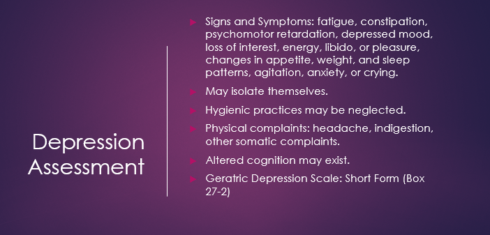 Symptoms: Fatigue, constipation, psychomotor retardation, persistent depressed mood, anhedonia, low energy, social withdrawal, neglect of hygiene or self-care, somatic complaints. Altered cognition is common and can mimic dementia.