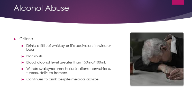 Substance abuse=inappropriate or excessive use of alcohol, caffeine, cannabis, hallucinogens, inhalants, opioids, sedatives, hypnotics, anxiolytics, stimulants, tobacco, and other or unknown substances that result in disorders