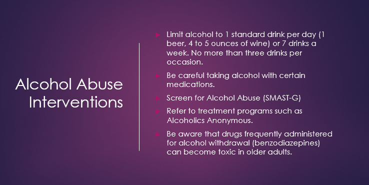 Alcohol Use: SMAST-G screening; two or more positive responses suggests an alcohol problem. Recommended limits typically not more than one standard drink per day for older adults.