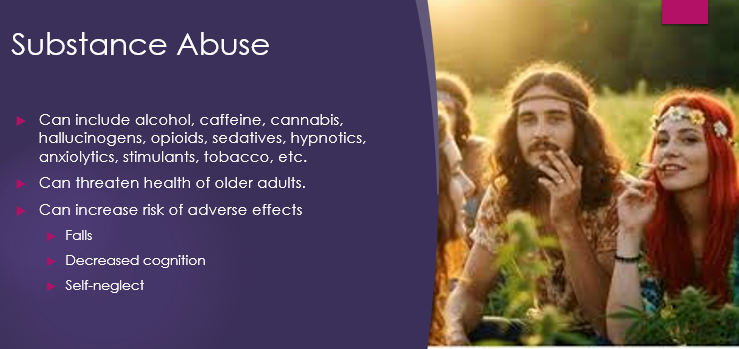 General Substance Abuse: Not rare; may involve prescription opioids and other substances; increased risk of falls, cognitive impairment, self-neglect.