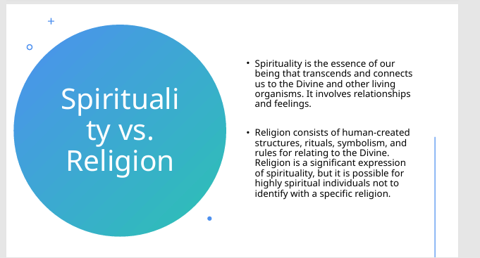 Religion=human-created structures, rituals, symbolism, and rules for relating to God/higher power