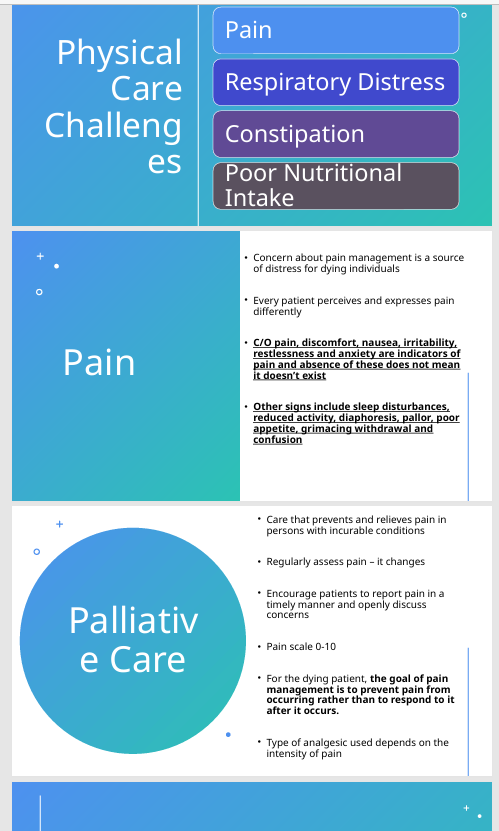 Palliative care=care that relieves suffering and provides comfort when cure is not possible