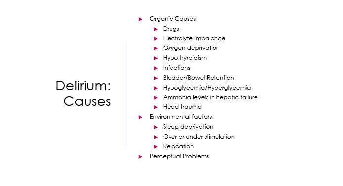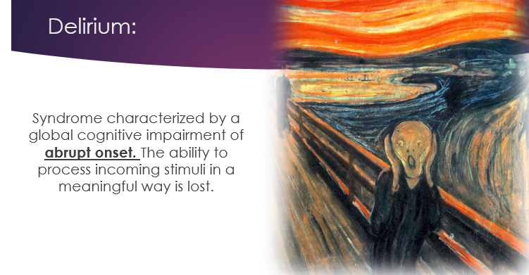Acute, abrupt global cognitive impairment with fluctuating mental status; may be worse at night.