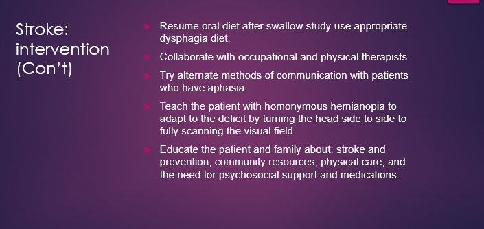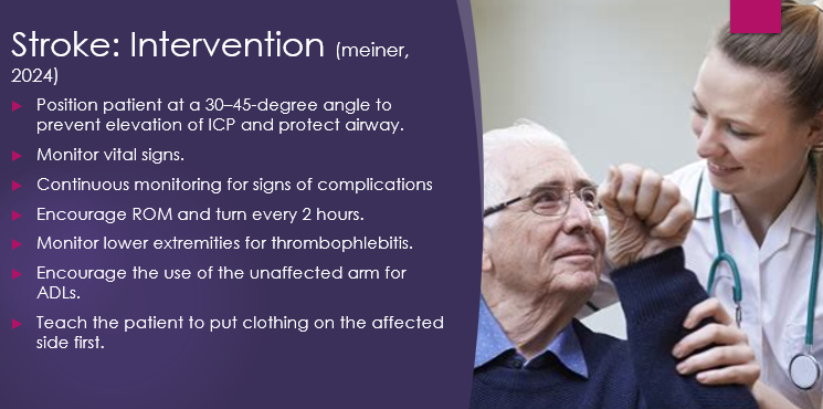 Acute Nursing Interventions: Keep head elevated, monitor vitals, turn and ROM every 2 hours, encourage use of unaffected arm for ADLs, ensure swallow safety and resumption of oral intake after swallow study.