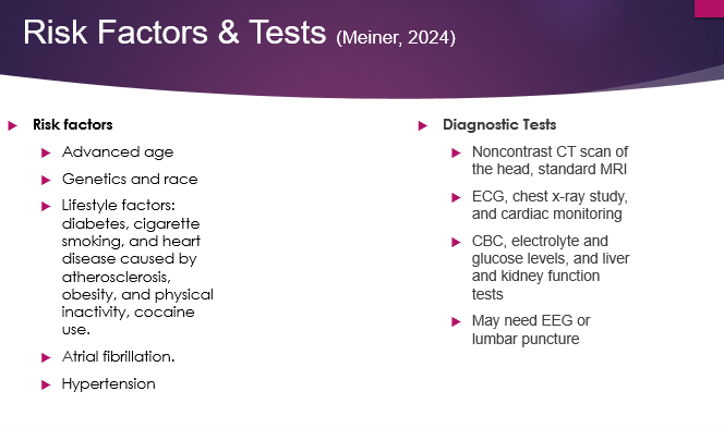 Risk Factors: Advanced age, genetics, African American ethnicity, diabetes, cigarette smoking, heart disease, obesity, physical inactivity, cocaine use, atrial fibrillation (AFib), hypertension (most important modifiable risk factor).