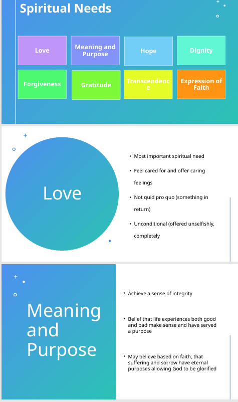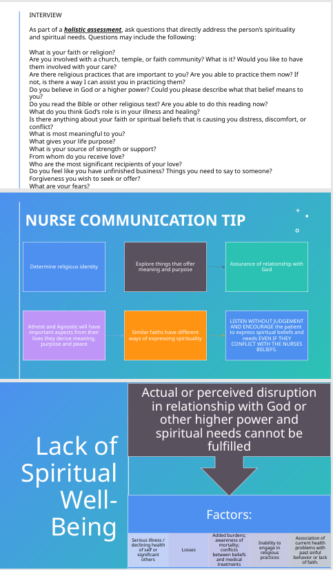 Lack of spiritual well-being=a disruption to the beliefs or practices related to one’s faith or relationship with God or other higher power, causing spiritual needs to be unfulfilled