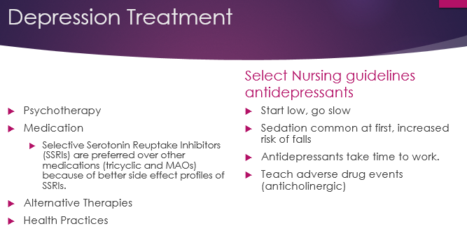 For Depression: Psychotherapy and nonpharmacologic approaches (acupuncture, guided imagery, light therapy, sleep, exercise, nutrition).