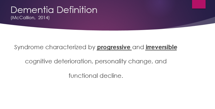 Progressive, irreversible cognitive deterioration with personality changes and functional decline.