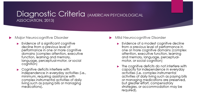 DSM-5 defines major neurocognitive disorder as dementia; mild neurocognitive disorder (MCI) is cognitive decline not yet affecting ADLs/IADLs.