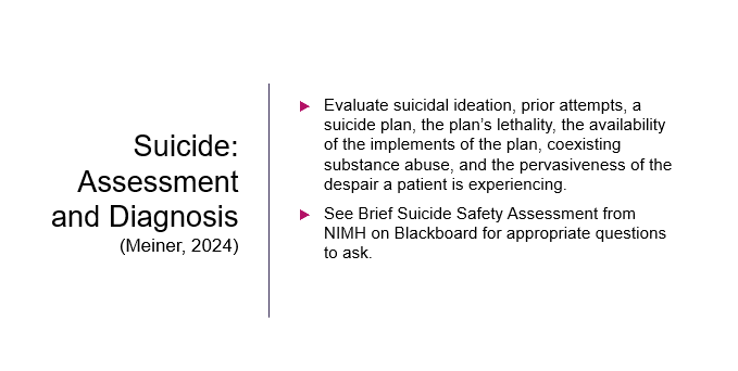 Use structured tools (e.g., National Institute of Mental Health resources) to assess frequency of thoughts, plan, past attempts, symptoms, and social support.