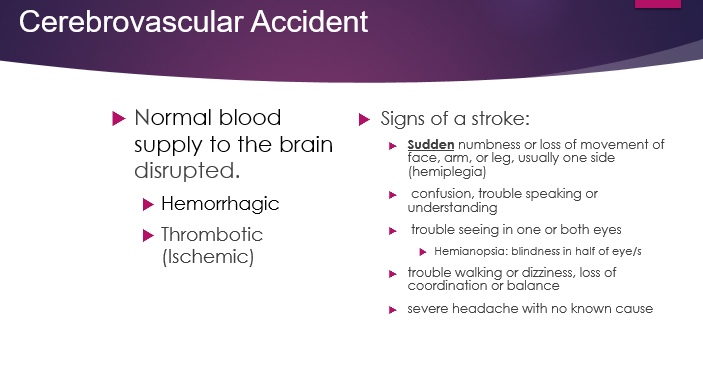 Cerebrovascular accident=stroke; interruption in blood supply to the brain