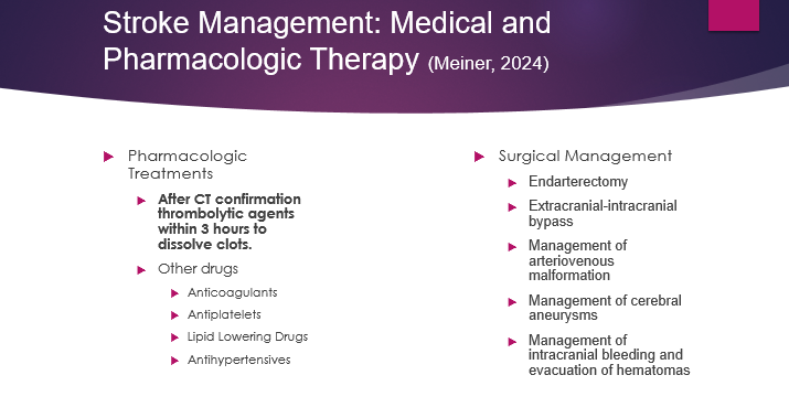 Medications and Interventions: Anticoagulants or antiplatelets depending on etiology; lipid-lowering agents and antihypertensives for long-term secondary prevention. Indirect vascular procedures (carotid endarterectomy or extracranial bypass) and brain surgery for certain conditions (aneurysms, malformations, intracranial bleeding).