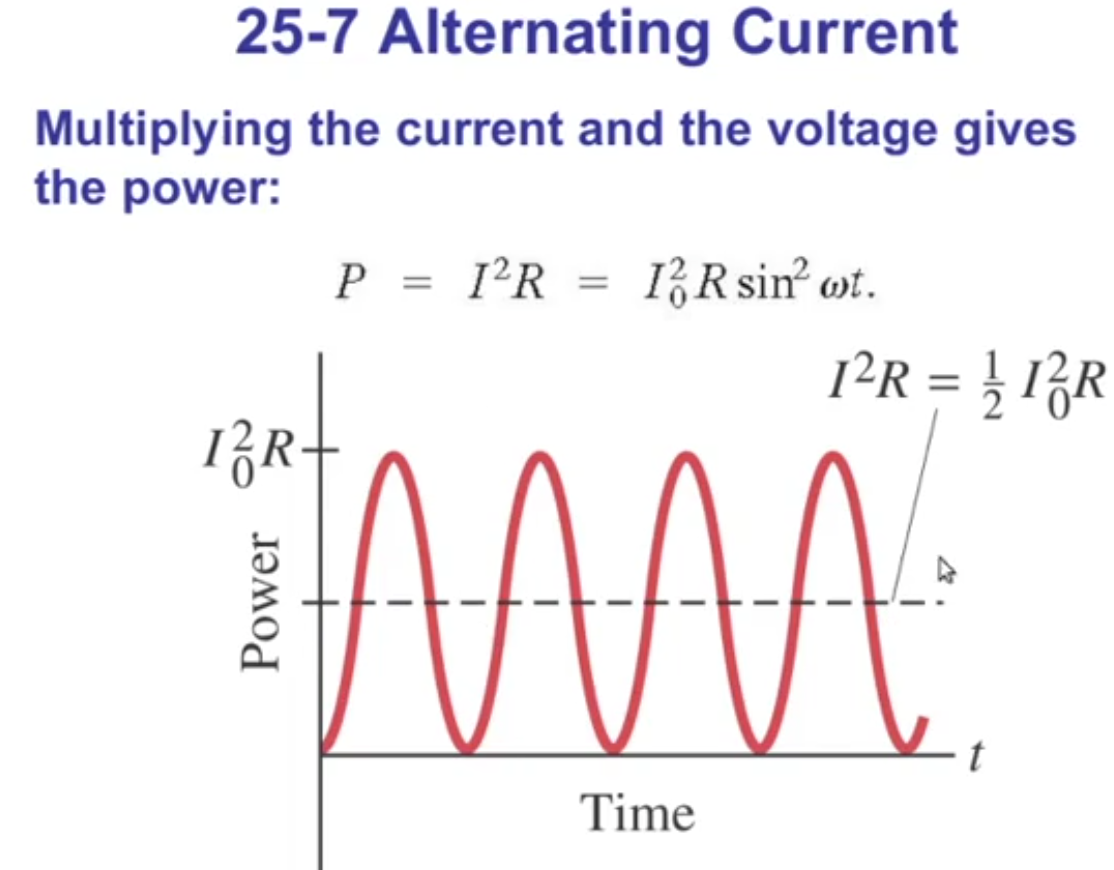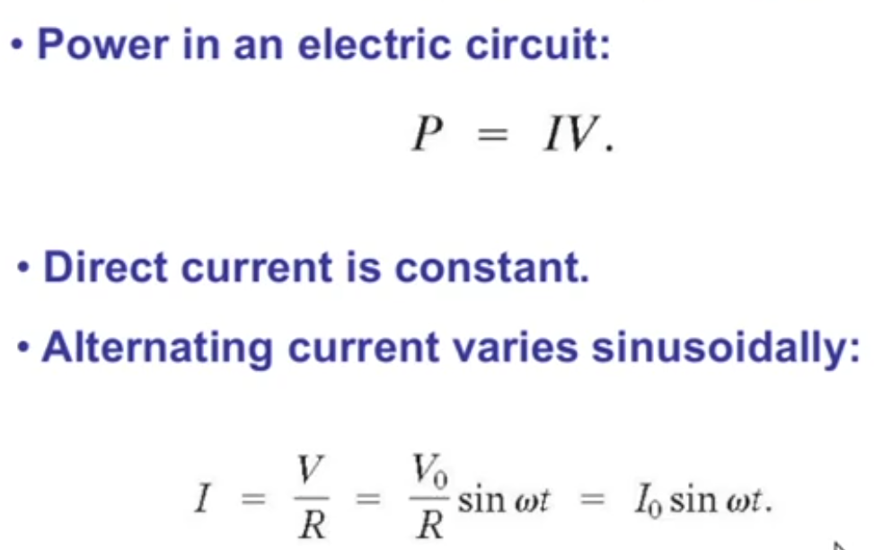 Alternating current varies sinusoidally: V = V_0 sin(\omega t).