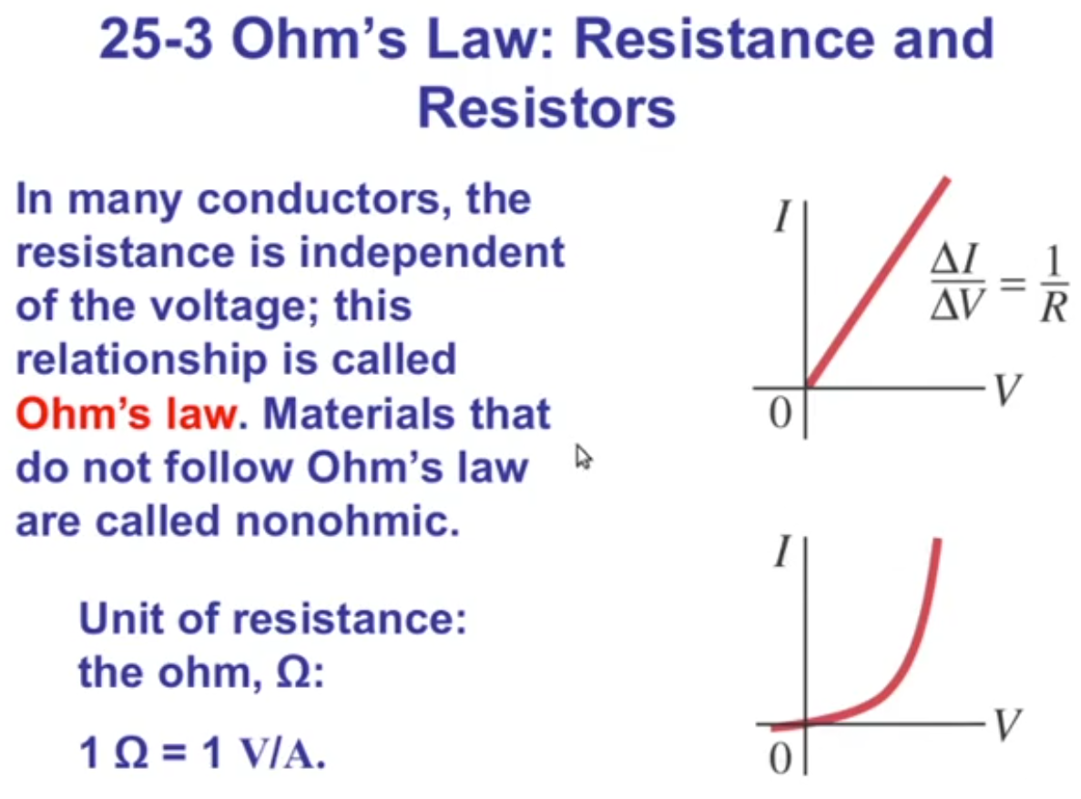 Resistance is the ratio of voltage to current: R = \frac{V}{I}.