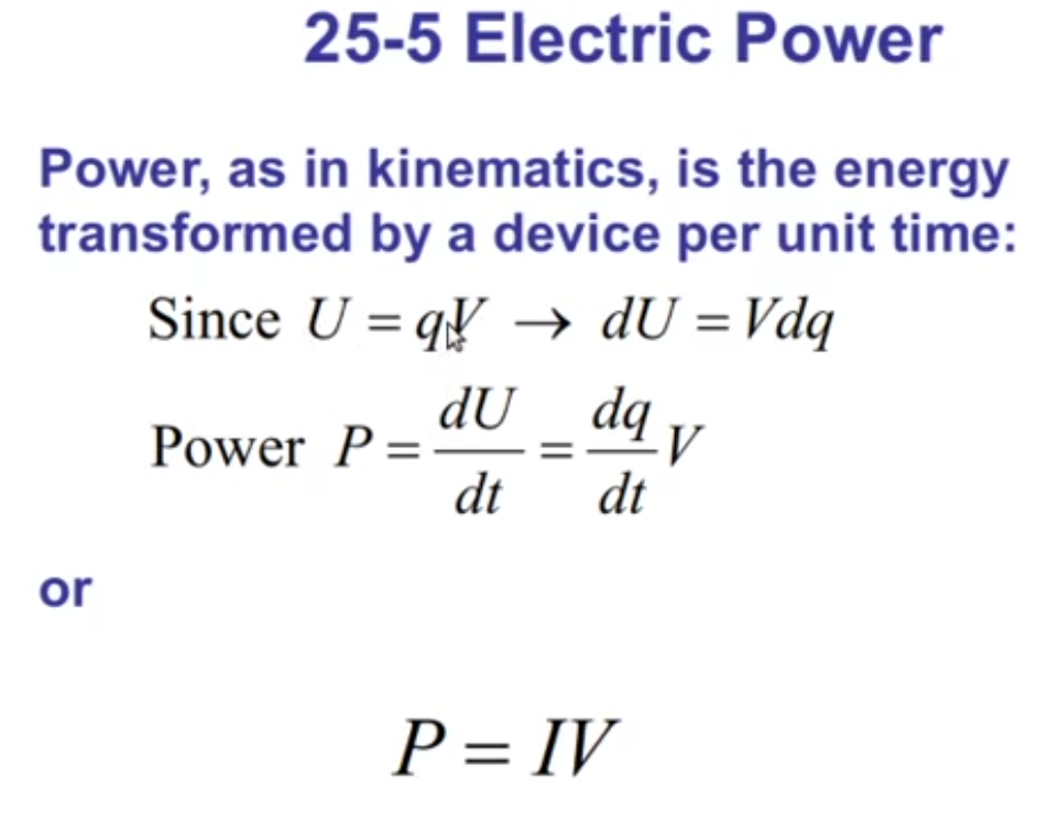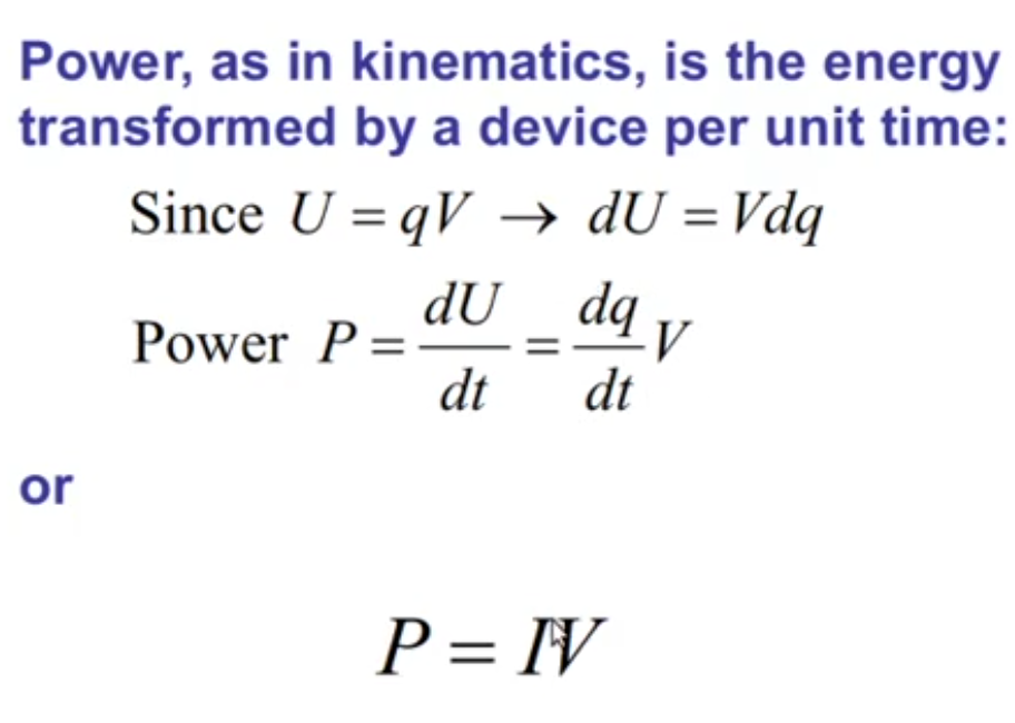 Power is the energy transformed by a device per unit time: P = \frac{dU}{dt}.
