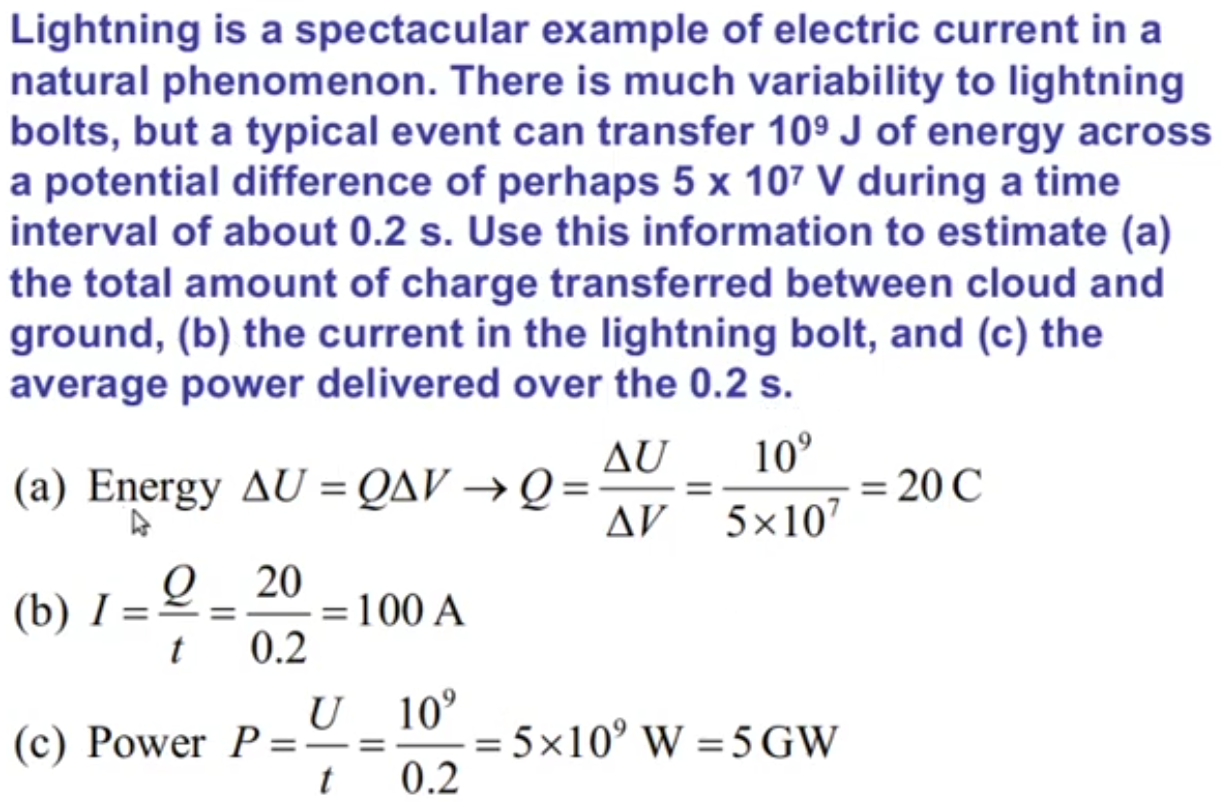 A typical lightning bolt transfers 10^9 J of energy across a potential difference of 5 * 10^7 V during a time interval of about 0.2 s.