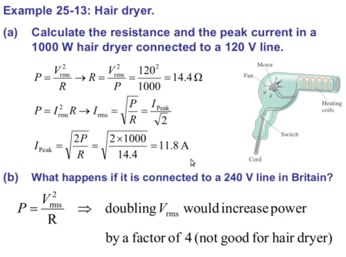 (a) Calculate the resistance and the peak current in a 1000 W hair dryer connected to a 120 V line.