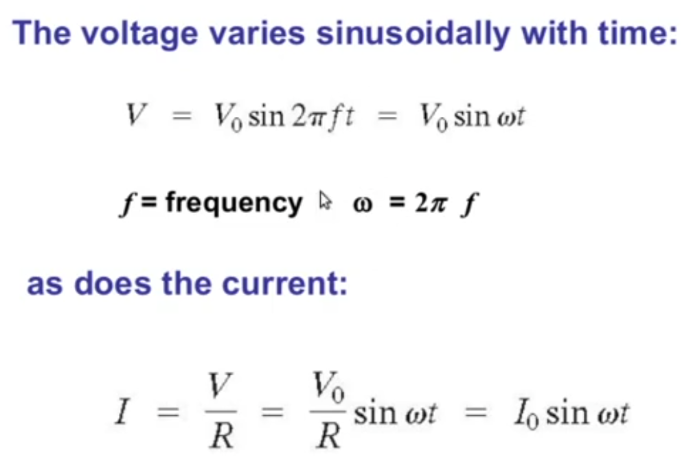 The voltage varies sinusoidally with time: V = V0 sin(\omega t), as does the current: I = I0 sin(\omega t).