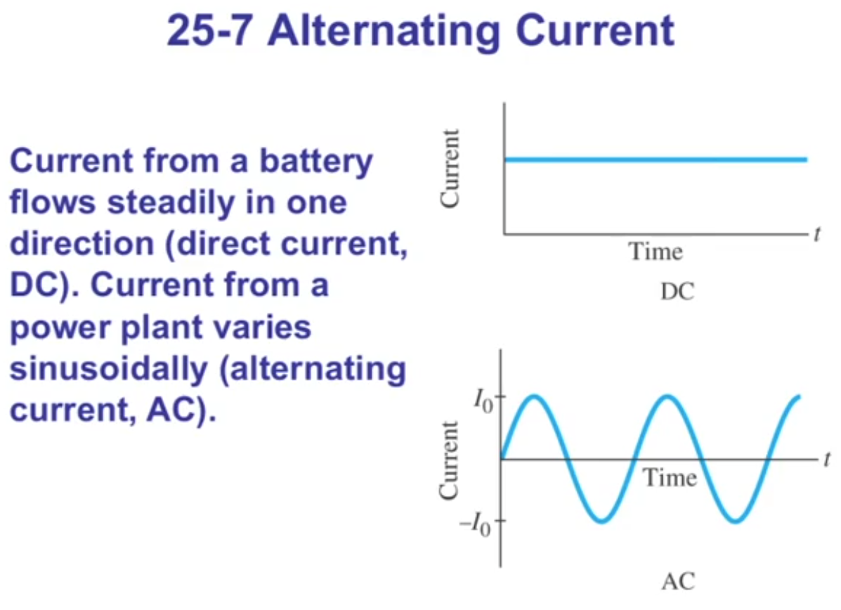 Current from a power plant varies sinusoidally (Alternating Current, AC).