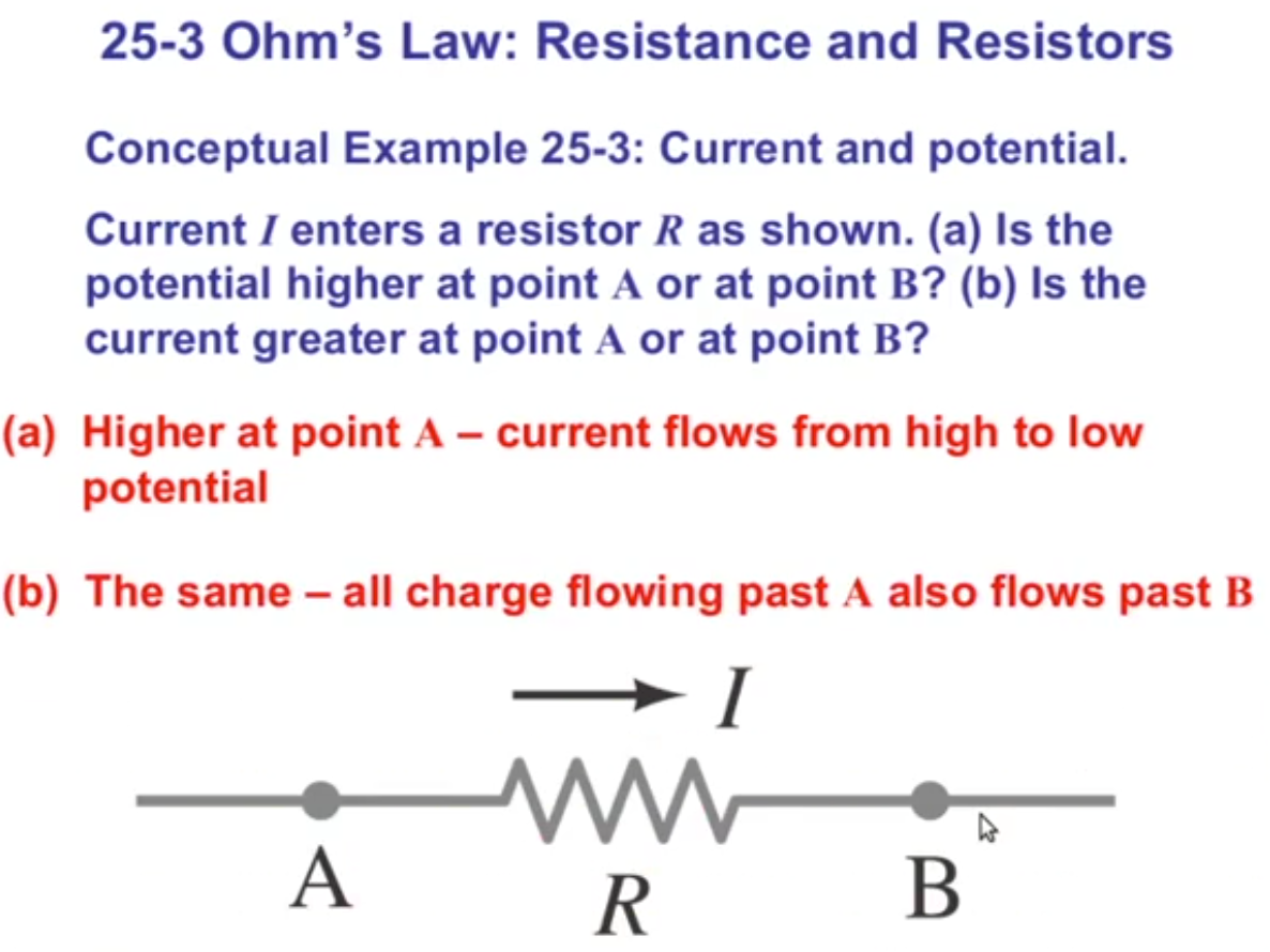 (b) Current is the same at points A and B because all charge flowing past A also flows past B.
