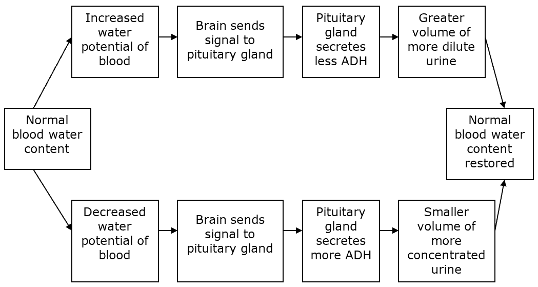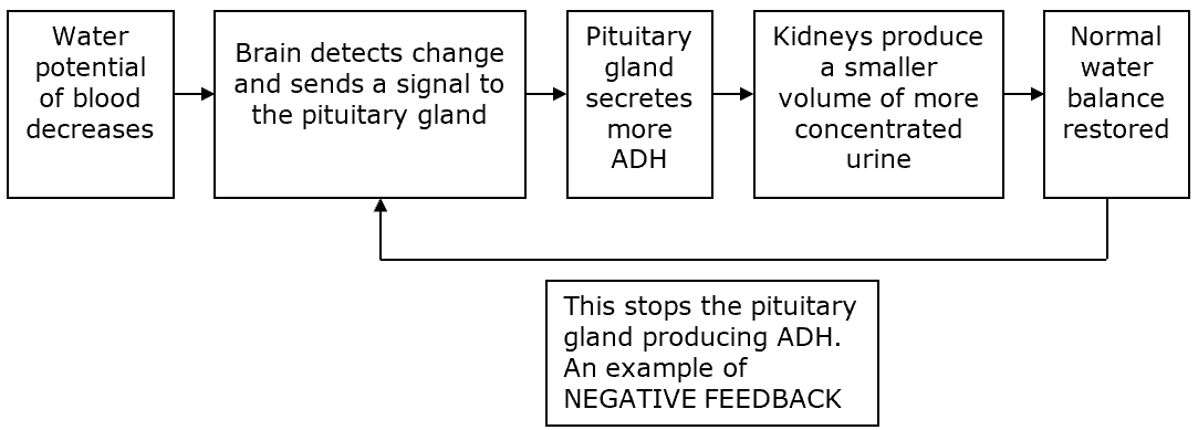 When balance is restored, ADH production stops — an example of negative feedback.