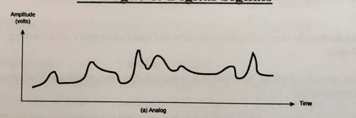 Analog signals: Continuous electrical signals that vary in amplitude, frequency, or phase. Used in telephone systems and older types of networking technologies.