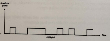 Digital signals: Discrete electrical signals that represent binary data (0s and 1s) Most common type of signal used in modern computer networks since they can be transmitted and processed more reliably than analog.