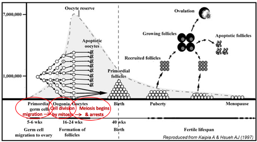 All the eggs a woman will ever have are made at this stage so the mitotic divisions are critical and this determines the level of fertility