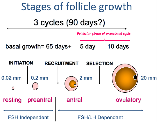 It takes ~3 months for a follicle to progress from a primordial follicle to a dominant follicle ready for ovulation.